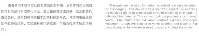 該(gai)設備用(yong)于扮料(liao)貯倉底(di)部或側(ce)面卸料(liao)用,設備(bei)帶有👺流(liu)化裝卸(xie)💑🏾料時能(neng)使物料(liao)流态化(hua)排出,通(tong)過輸送(song)管道或(huo)斜槽,配(pei)合散裝(zhuang)機直接(jie)裝料